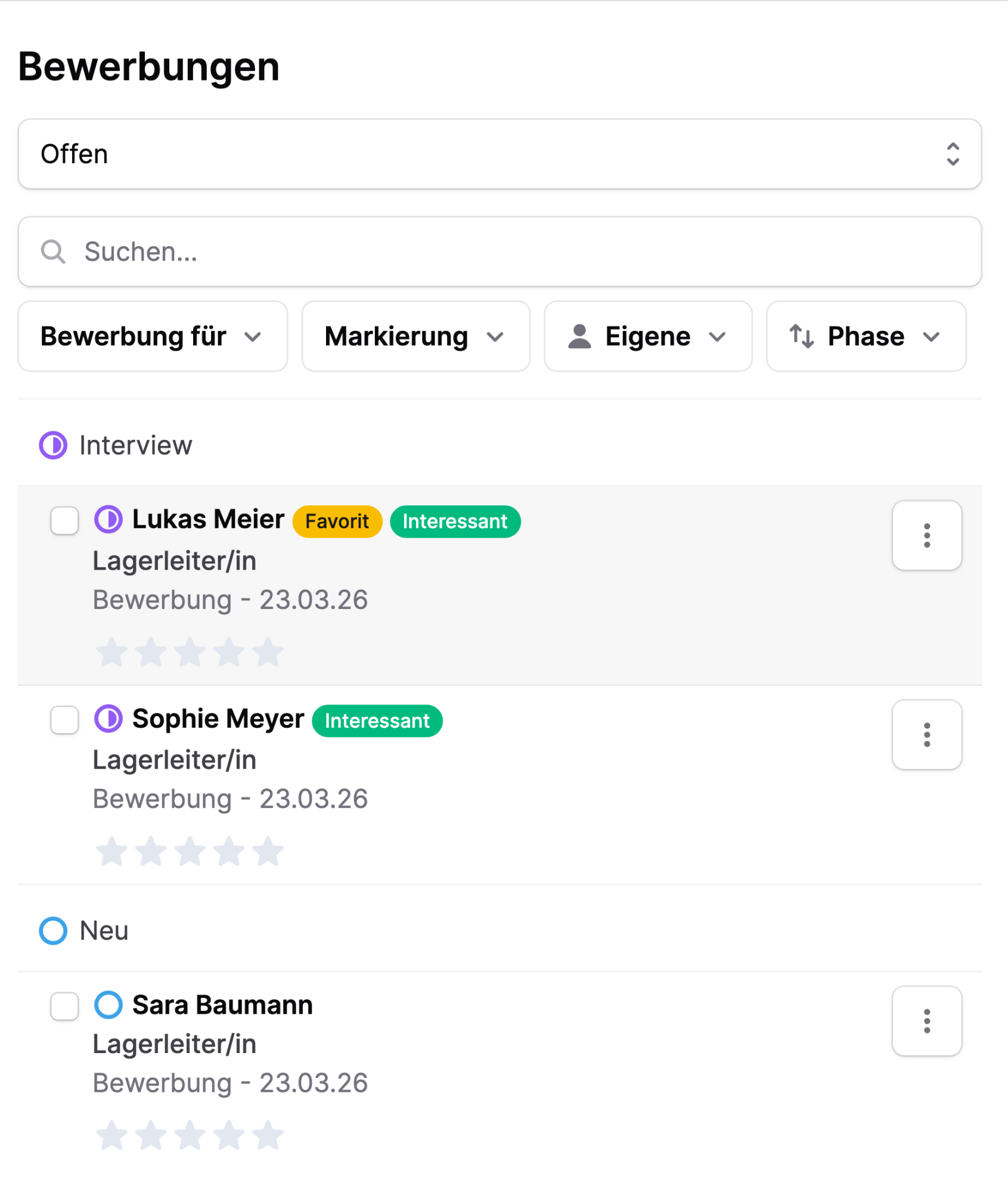 Offen, Pool, Eingestellt, Abgeschlossen. Jede Bewerbung hat eine klare Phase, jeder Tab seinen Zweck.