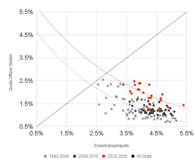 Ab 2009 verschiebt sich das Bild. Die Kurve wandert nach oben – bei gleicher Erwerbslosenquote mehr offene Stellen. Der Trend verstärkt sich ab 2019: Die roten Punkte liegen deutlich über den grauen.