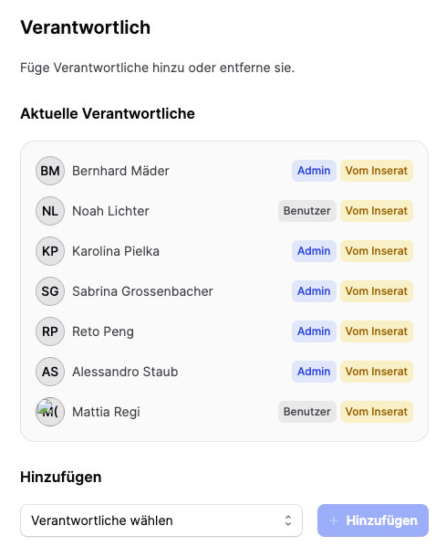 Benutzer können Inseraten und Bewerbungen zugewiesen werden. Bewerbungen übernehmen standardmässig die Zuweisung des jeweiligen Inserats. Benachrichtigungen erreichen nur die zugewiesenen Personen.